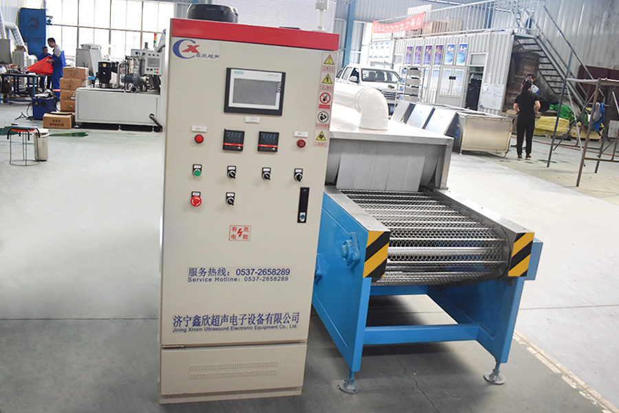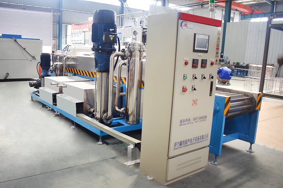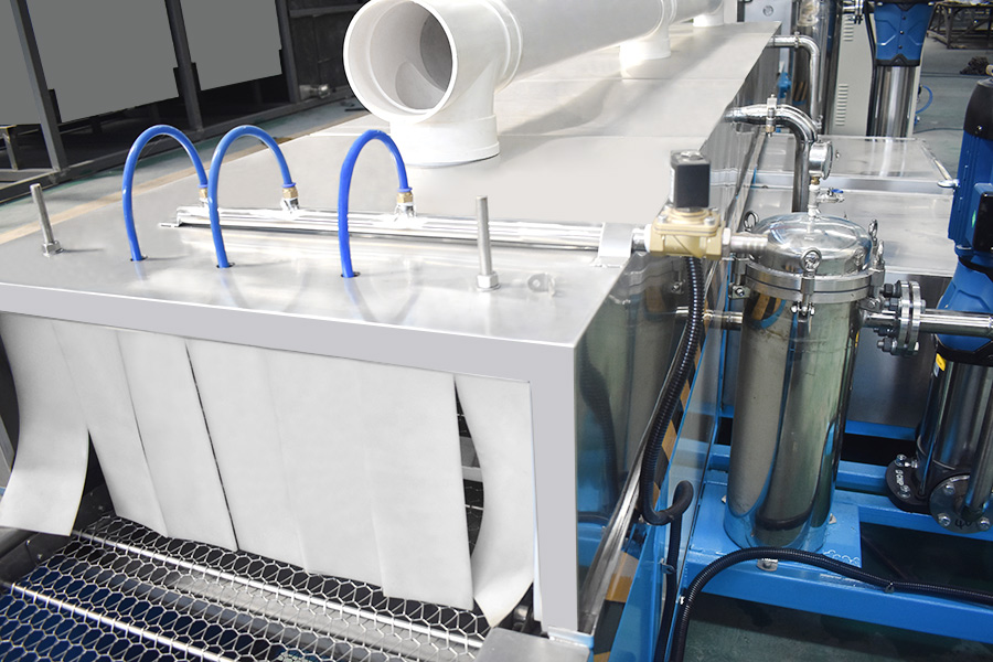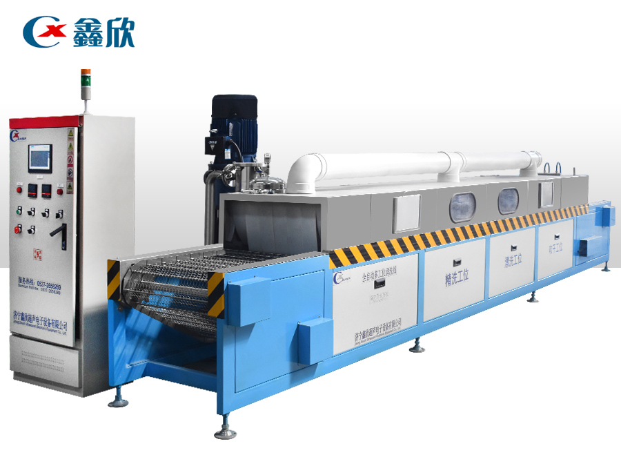 該設備有上下料網帶、超聲波清洗工位、噴淋漂洗工位、高壓風切、熱風烘干工位、溫控水加熱系統、風機、溫控空氣加熱系統、移動式風刀、PLC+觸摸屏控制系統、管路系統及智能電器控制系統等組成。自動進排液和自動加溫系統完全實現了無人干預,自動運行,很大程度上降低了工人的勞動強度。先進的霧氣處理系統可以將清洗時產生的霧氣冷凝回流,空氣經過濾和活性炭吸附后排出。