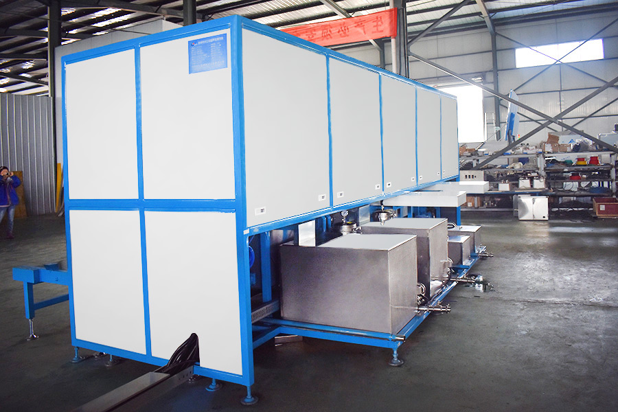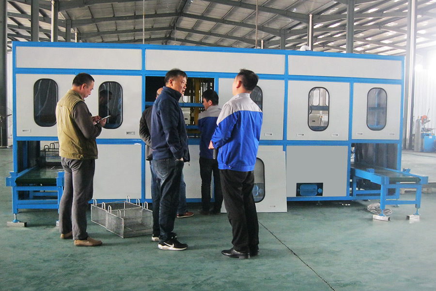 該設備有自動上下料及轉角系統、超聲波清洗系統,自動拋動、自動溢流和油污分離裝置,噴淋系統、自動高壓切水系統、自動烘干系統。機械手自動輸送系統采用高精度直線導軌配合高精度位置檢測傳感器,機械手可以準確的實現工件的抓取和放置。自動進排液和自動加溫系統完全實現了無人干預,自動運行,很大程度上降低了工人的勞動強度。先進的霧氣處理系統可以將清洗時產生的霧氣冷凝回流,空氣經過濾和活性炭吸附后排出。