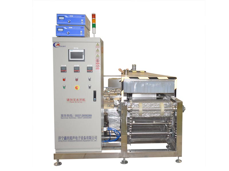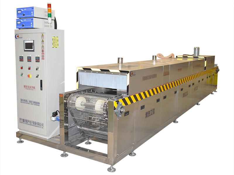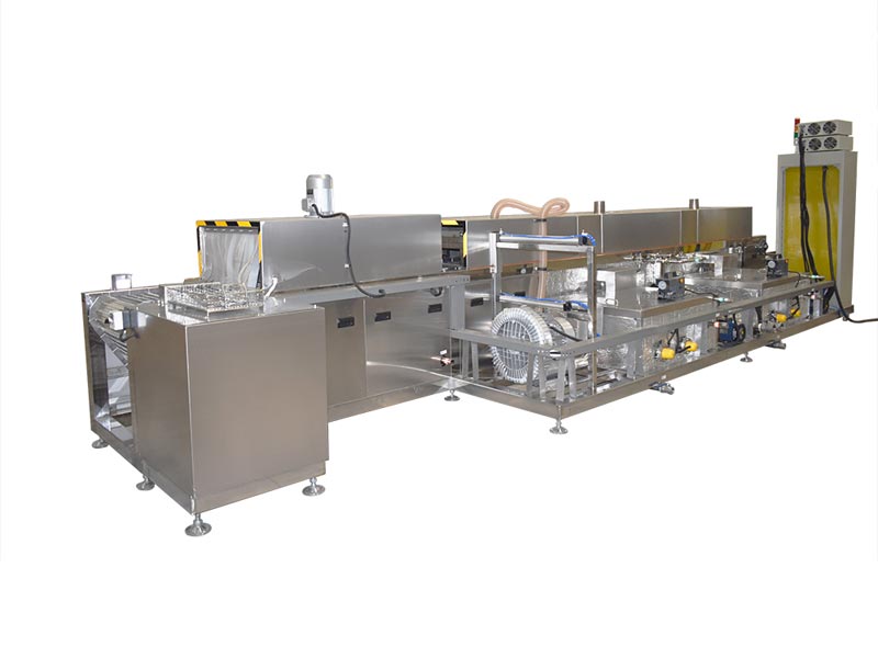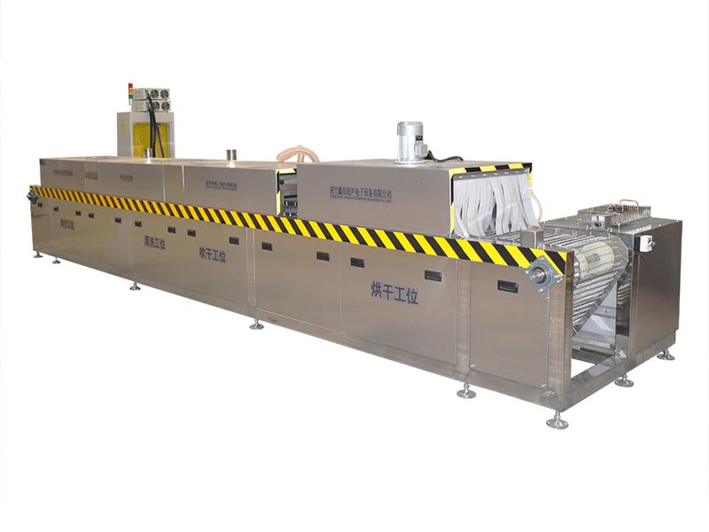 該設(shè)備有上下料網(wǎng)帶、超聲波清洗工位、超聲波漂洗工位、高壓風(fēng)切、熱風(fēng)烘干工位、溫控水加熱系統(tǒng)、風(fēng)機、溫控空氣加熱系統(tǒng)、移動式風(fēng)刀、PLC+觸摸屏控制系統(tǒng)、管路系統(tǒng)及智能電器控制系統(tǒng)等組成。自動進排液和自動加溫系統(tǒng)完全實現(xiàn)了無人干預(yù),自動運行,很大程度上降低了工人的勞動強度。先進的霧氣處理系統(tǒng)可以將清洗時產(chǎn)生的霧氣冷凝回流,空氣經(jīng)過濾和活性炭吸附后排出。